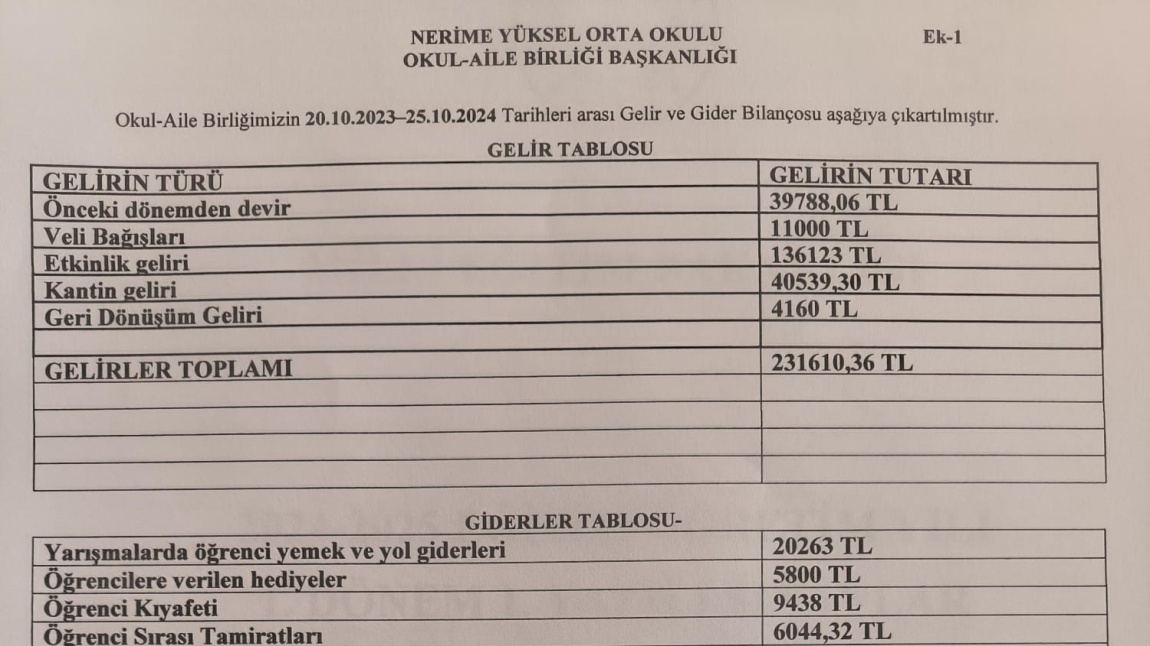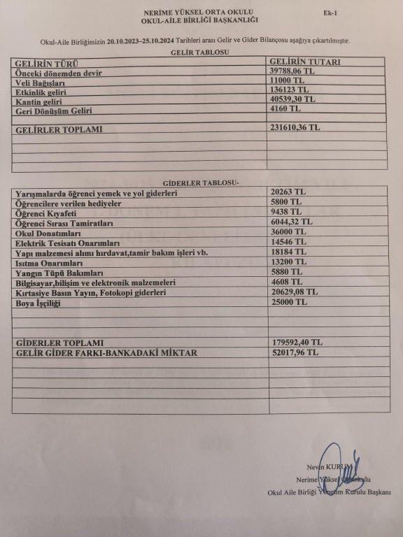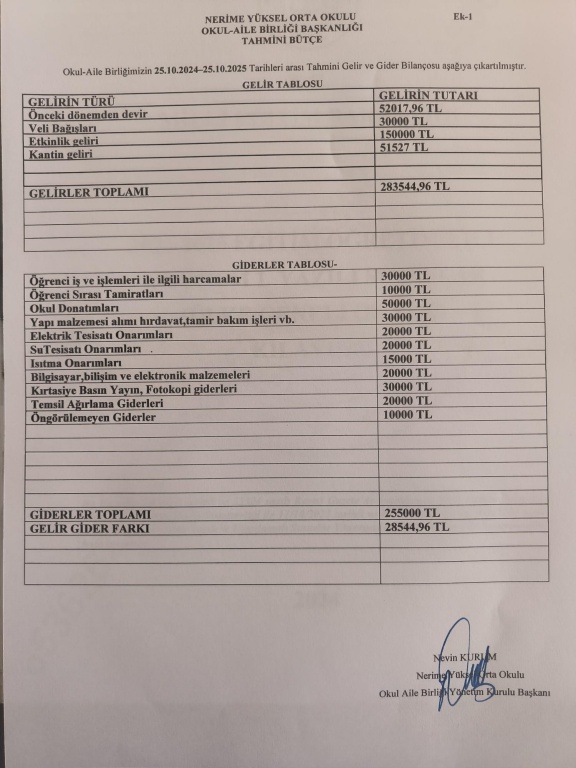 25.10.2024 tarihinde yapılacak olan Okul Aile Birliği toplantısına ait son 1 yıllık gelir gider tablosu, denetim kurulu raporu ve tahmini bütçe ekte sunulmuştur.